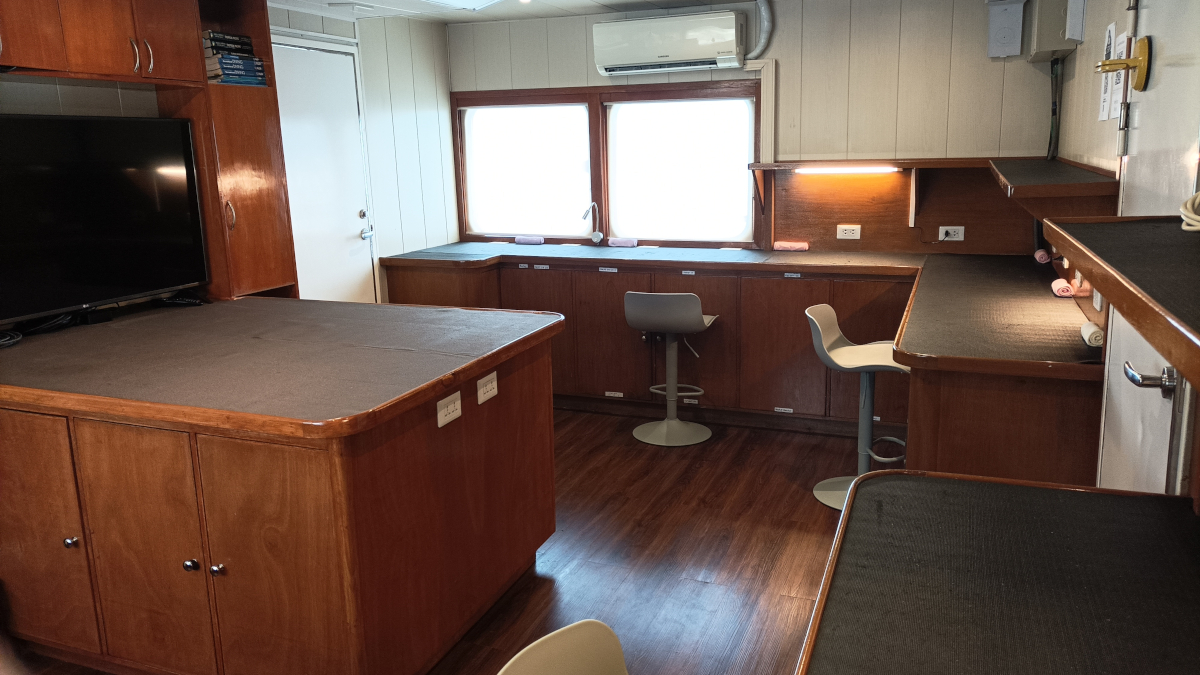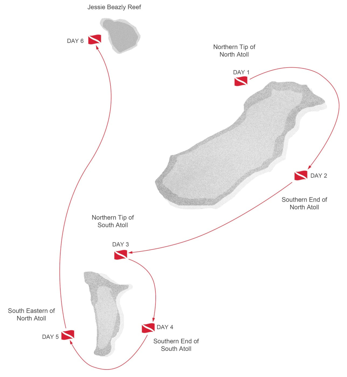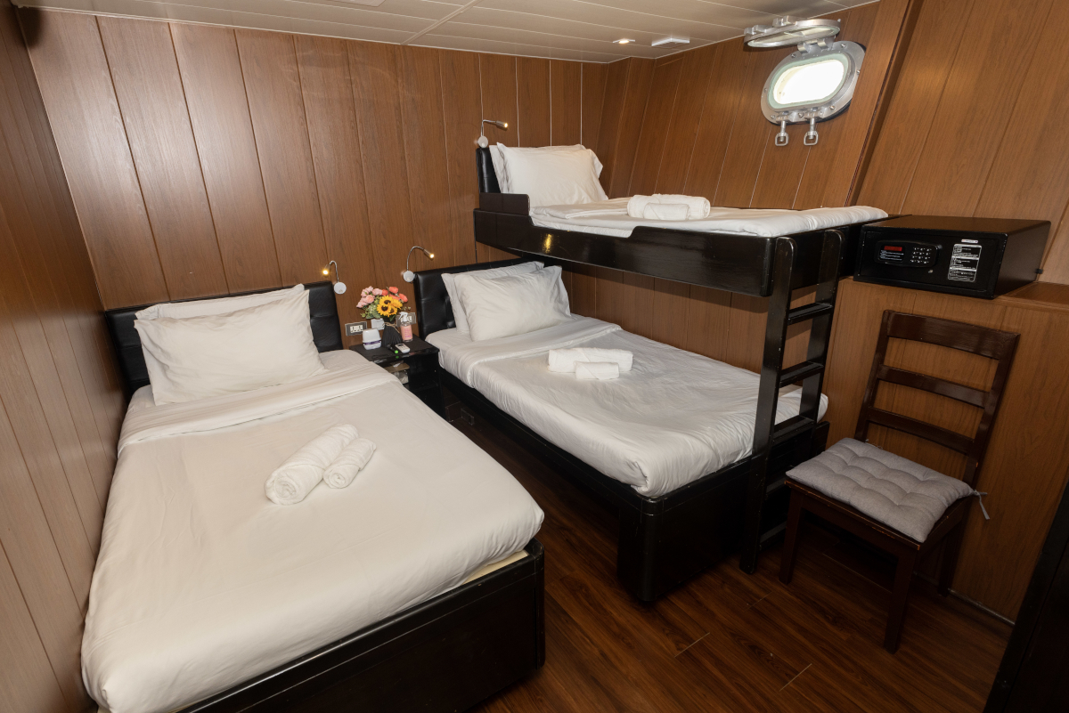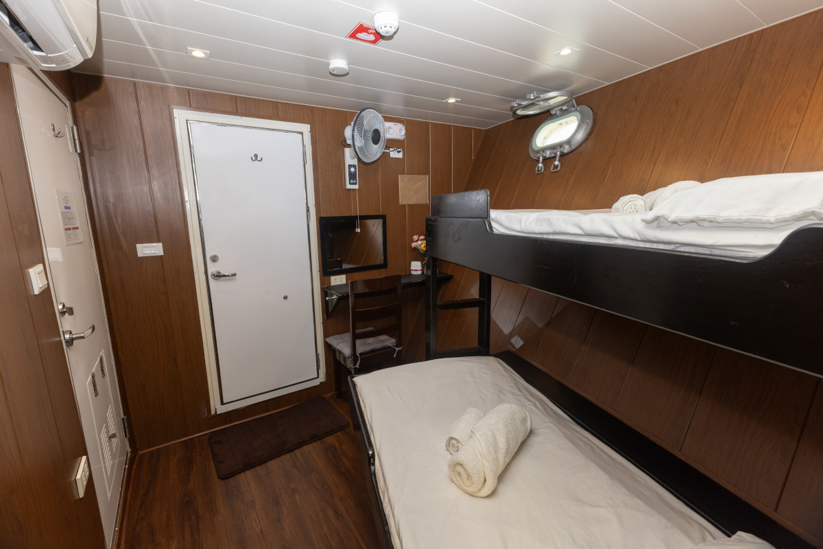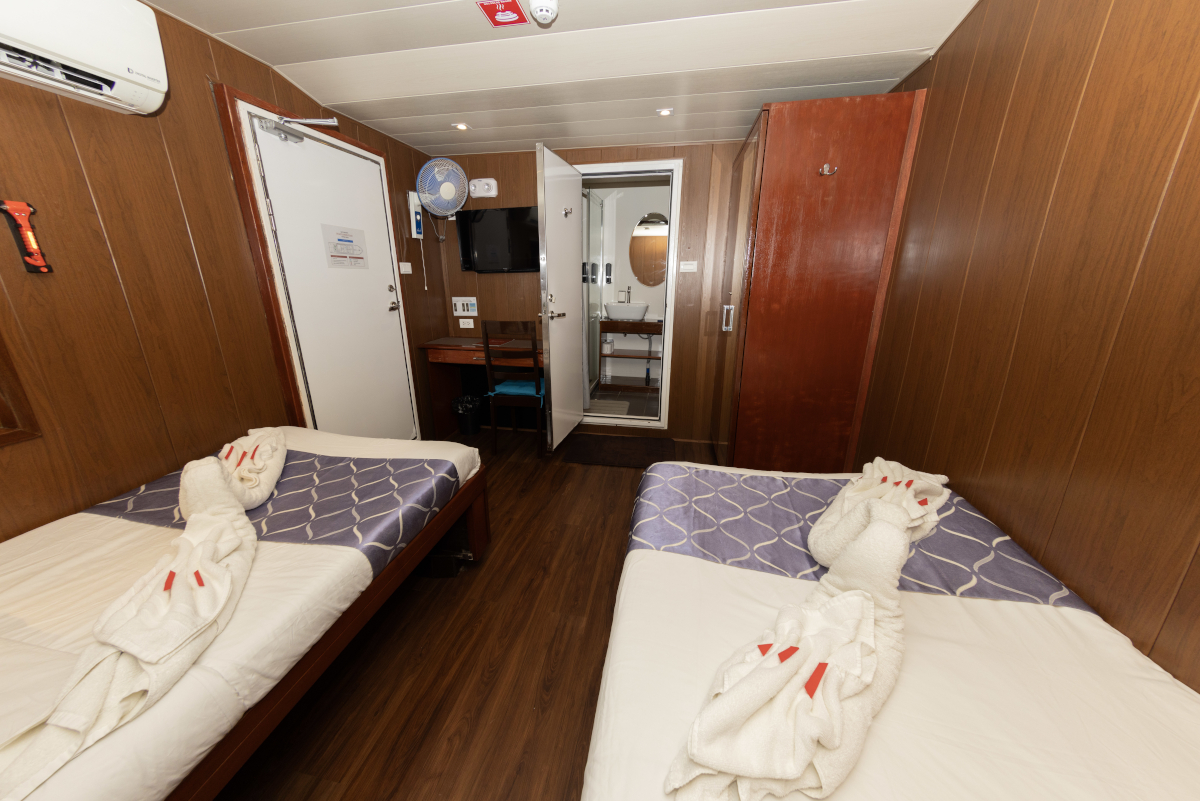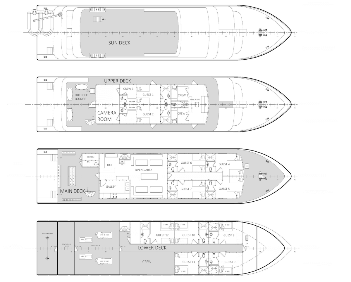 Lunghezza: 39 mt – Larghezza: 8 mt – Elettricità: 110 v – Numero massimo di passeggeri: 25 – N° cabine: 6 cabine premium deluxe, 3 cabine triple deluxe, 2 cabine doppie deluxe, con servizi privati – Tutte le cabine sono dotate di aria condizionata, doccia e asciugacapelli – Ponte prendisole parzialmente coperto con chaise longue – Bar – TV e aree salotto con tavoli – Piccola biblioteca e negozio di bordo con l’attrezzatura subacquea essenziale e altri souvenir – Noleggio attrezzatura – Nitrox disponibile, a pagamento