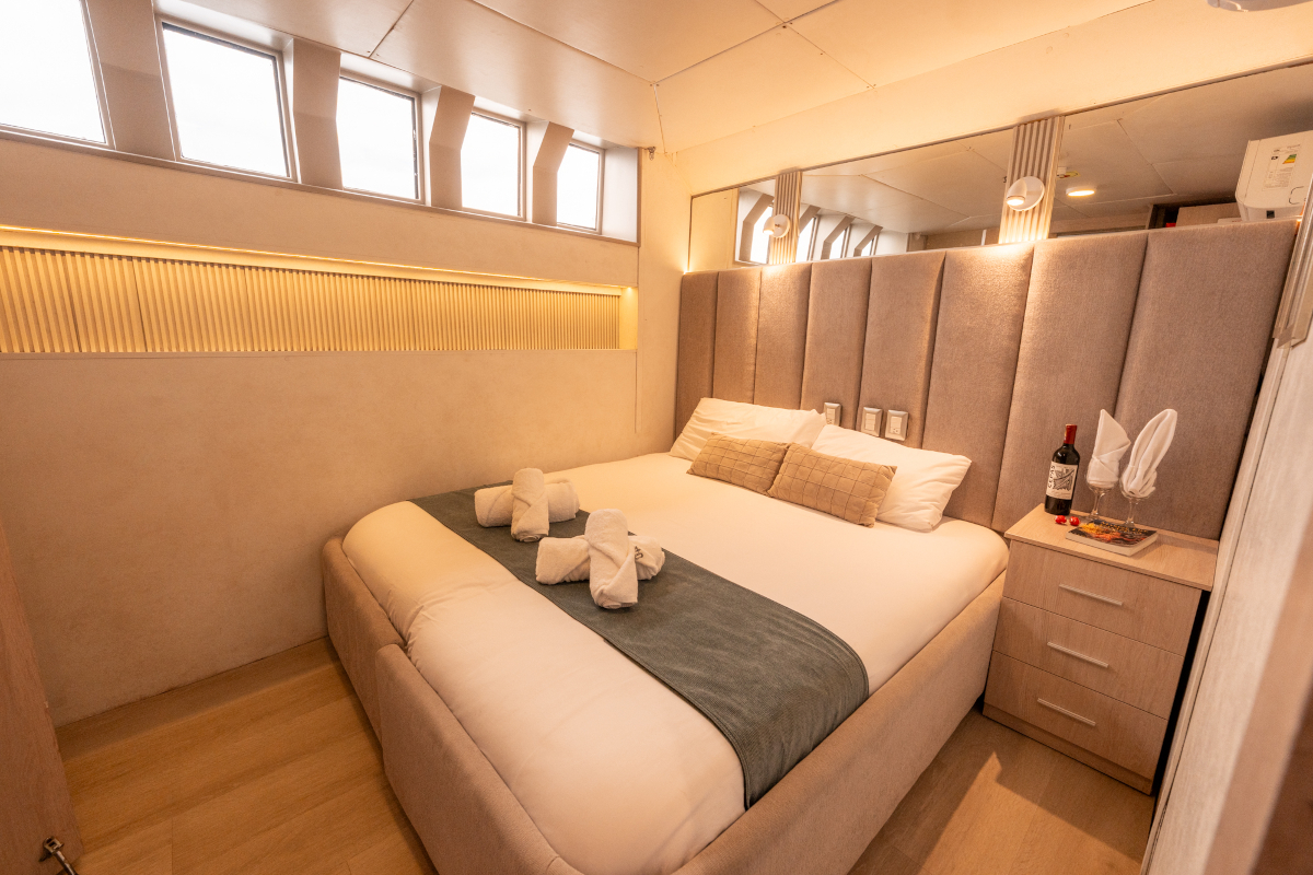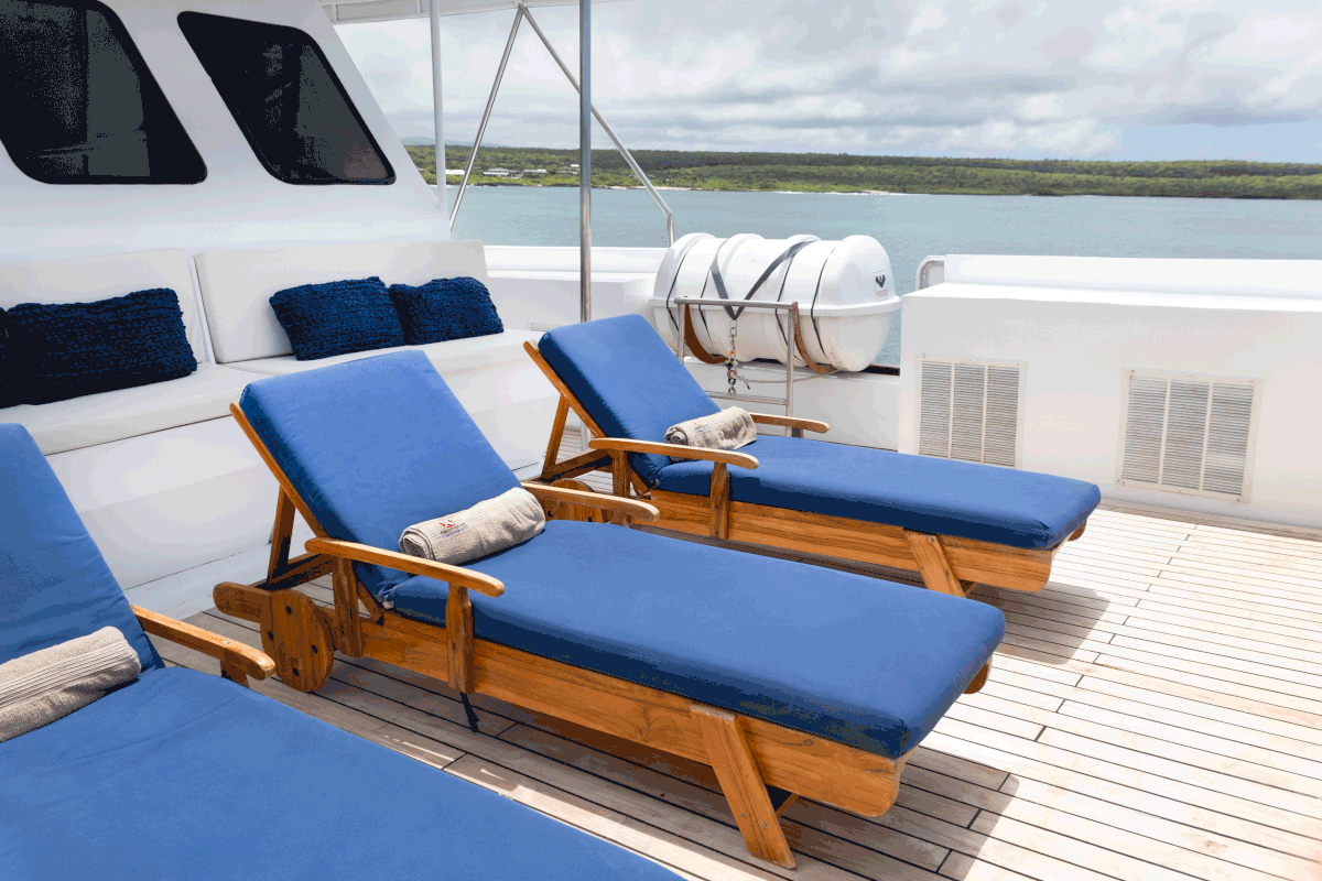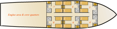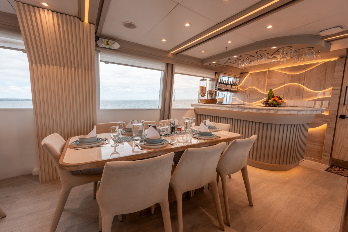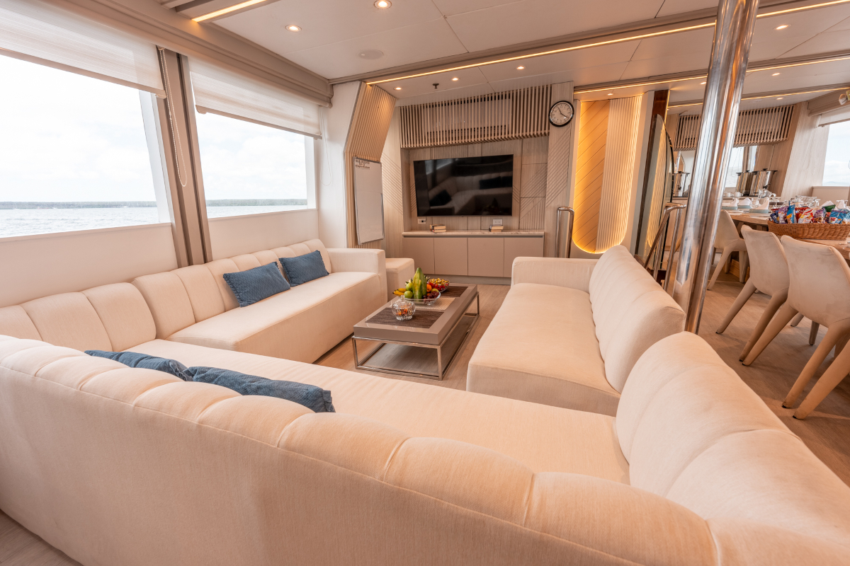 • Lunghezza : 34 metri • Larghezza: 6,5 metri • Velocità massima:10 nodi • Elettricità: 110 v • Numero massimo di passeggeri: 16 • Aria Condizionata • N° Cabine: 8 cabine di cui 2 sul ponte principale e 6 sul ponte inferiore, con bagno privato e docce• Tutte le cabine sono dotate di aria condizionata, tv e vista sull’oceano • Terrazza solarium parzialmente coperta con vasca idromassaggio e ampie sedute • Salone con sala da pranzo e una bar • Stazione di ricarica per macchine fotografiche • Noleggio attrezzatura • 2 Tender per le immersioni
