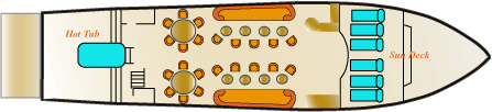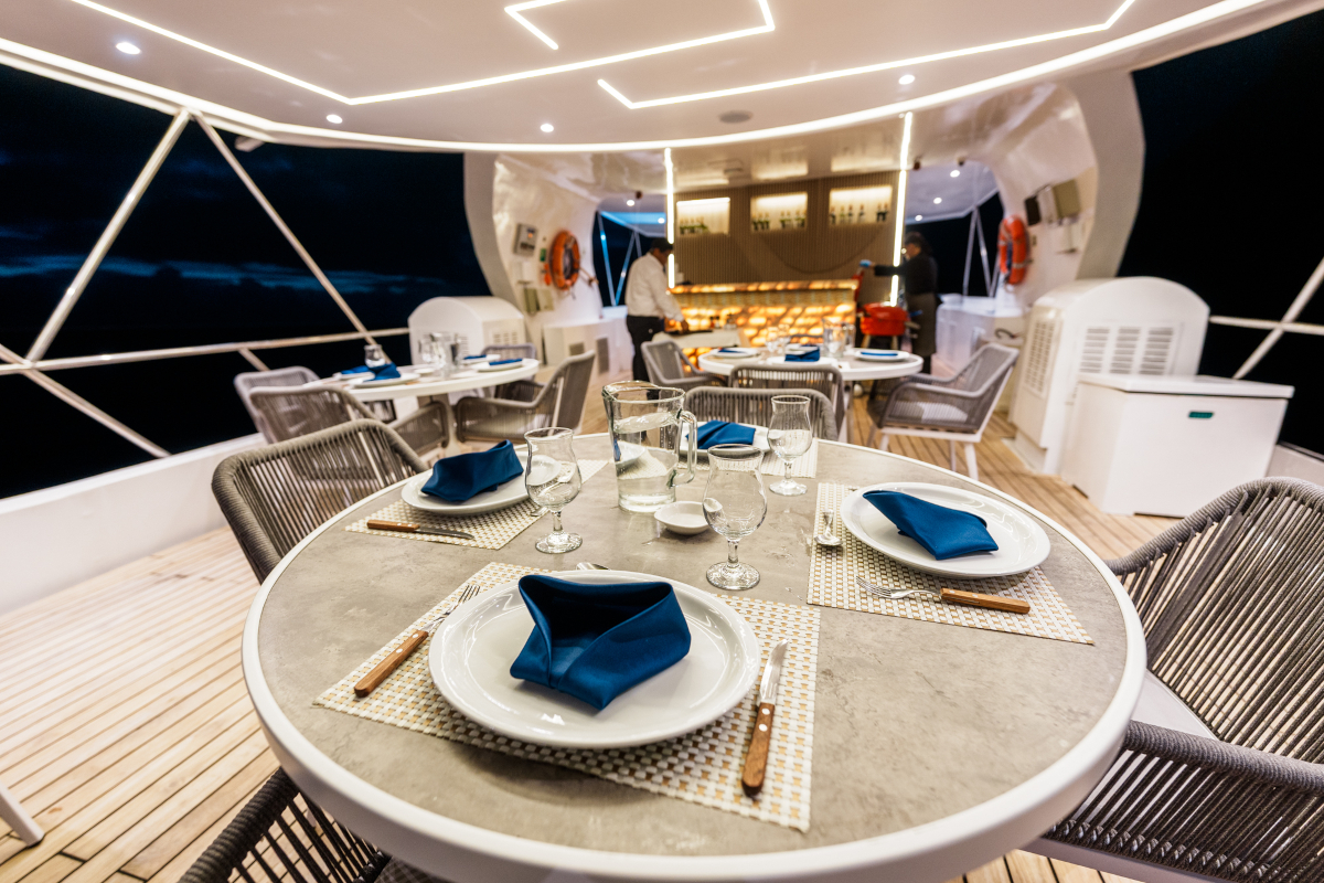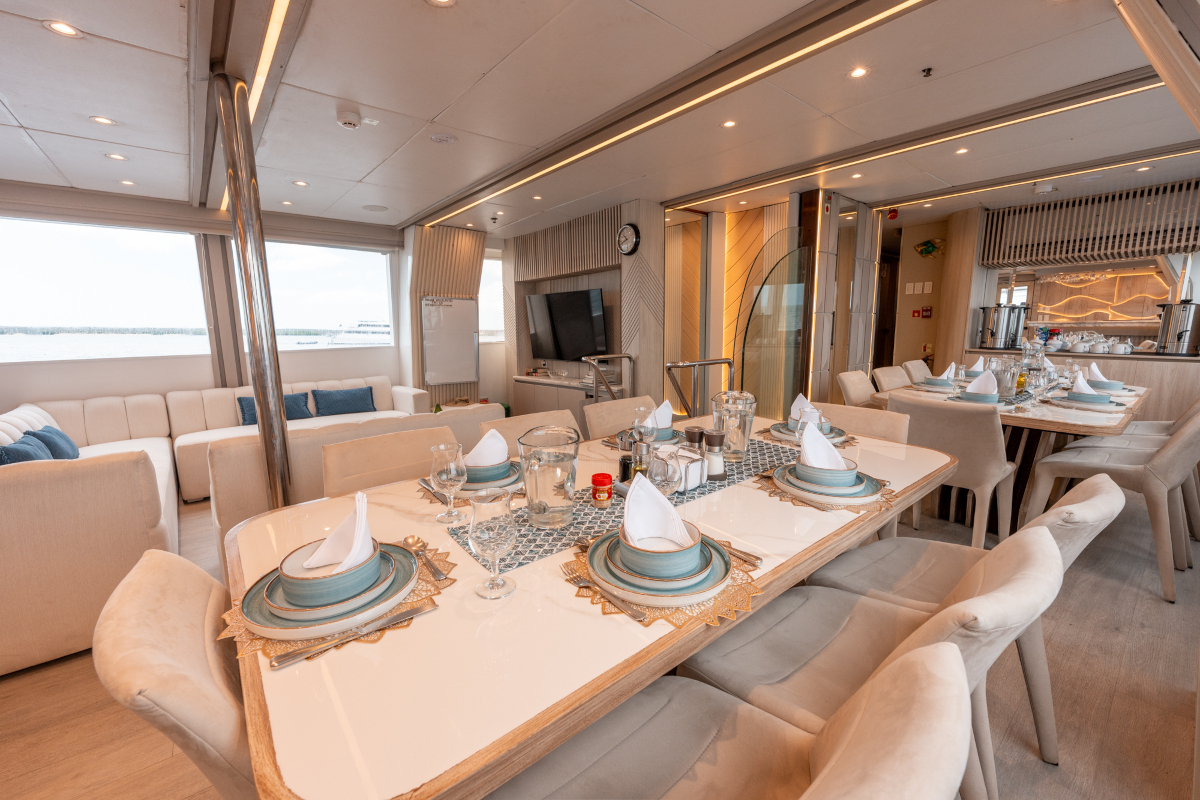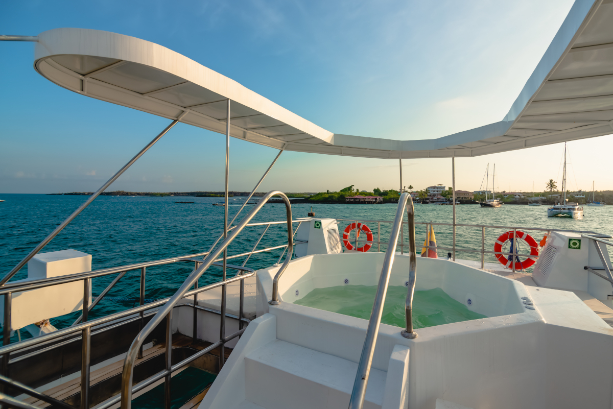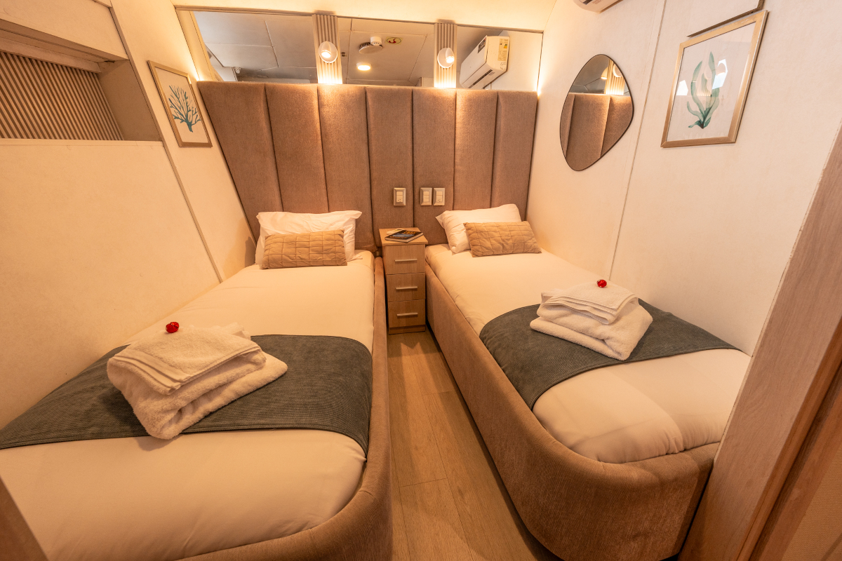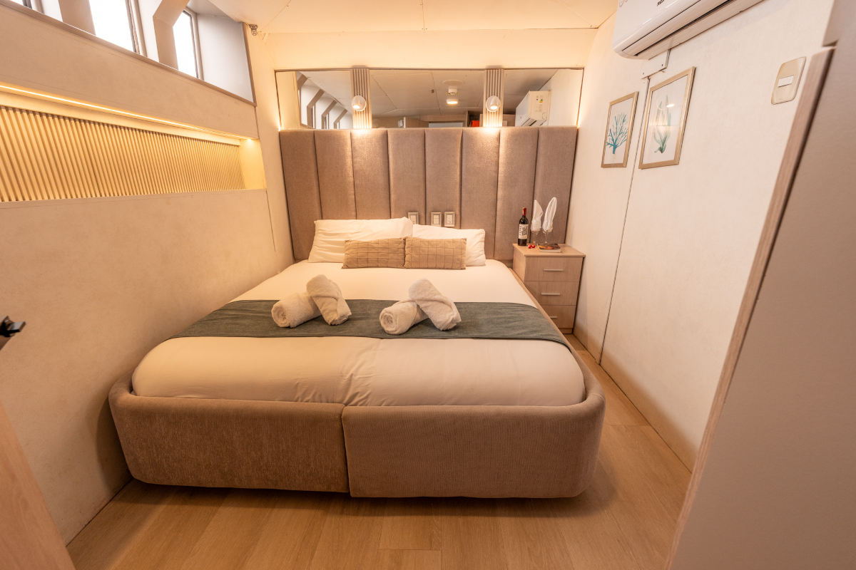 • Lunghezza : 34 metri • Larghezza: 6,5 metri • Velocità massima:10 nodi • Elettricità: 110 v • Numero massimo di passeggeri: 16 • Aria Condizionata • N° Cabine: 8 cabine di cui 2 sul ponte principale e 6 sul ponte inferiore, con bagno privato e docce• Tutte le cabine sono dotate di aria condizionata, tv e vista sull’oceano • Terrazza solarium parzialmente coperta con vasca idromassaggio e ampie sedute • Salone con sala da pranzo e una bar • Stazione di ricarica per macchine fotografiche • Noleggio attrezzatura • 2 Tender per le immersioni