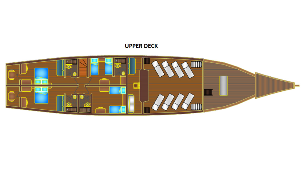 La barca dispone di un totale di 6 cabine : 4 cabine doppie con letto matrimoniale (23mq.) e una cabina con letti separati (18mq.) sul Ponte Principale; nel ponte inferiore si trova una cabina con letti separati (15mq.). Sono tutte dotate di grandi finestre che forniscono molta luce naturale e viste mozzafiato sull’oceano. Il ponte superiore è dotato di otto lettini e il ponte principale dispone di un’area relax, trasformabile in una sala da pranzo all’aperto. Il salone e la sala da pranzo con aria condizionata sono situati sul ponte principale insieme alla biblioteca e l’intrattenimento audio e video. La programmazione prevede tre immersioni al giorno con la possibilità di farne una quarta in notturna, snorkeling e visite a terra per vivere le meraviglie di Komodo, come le spiagge rosa e i varani. Il Nitrox è disponibile, a pagamento.
