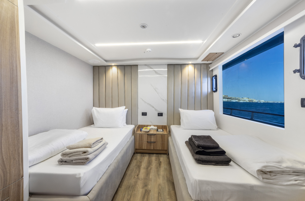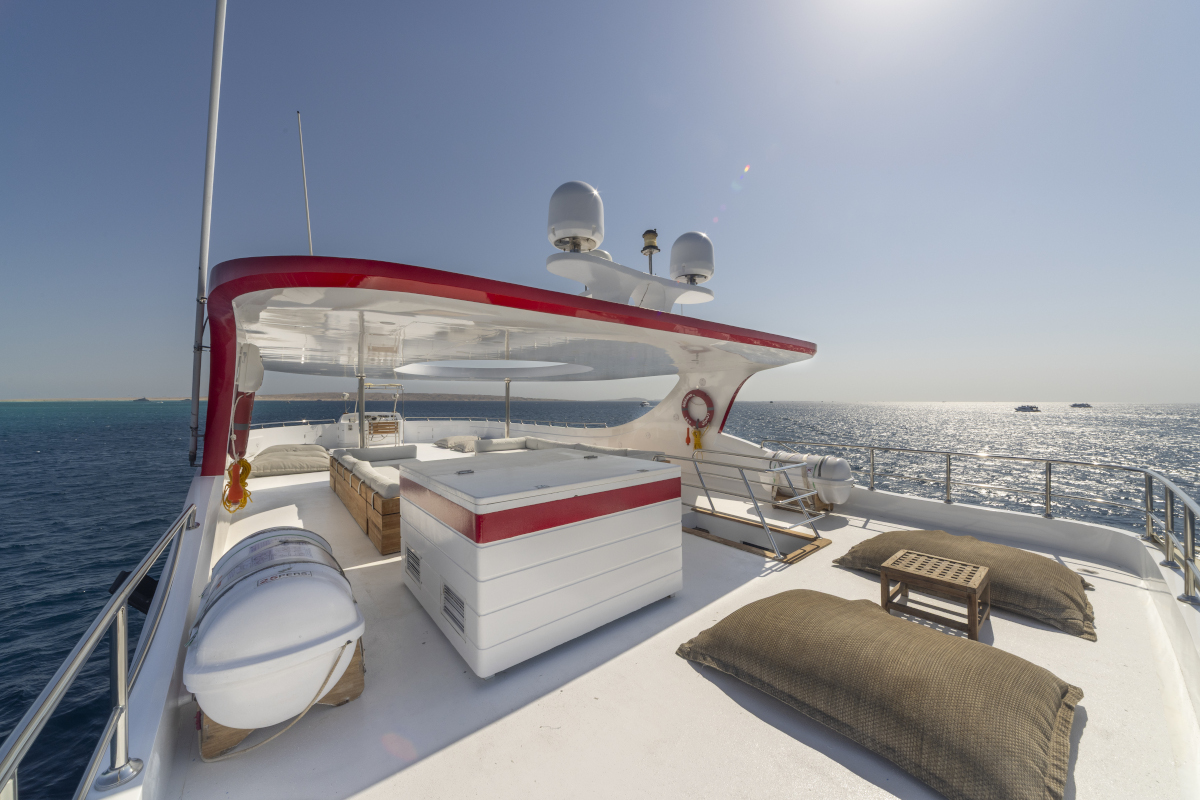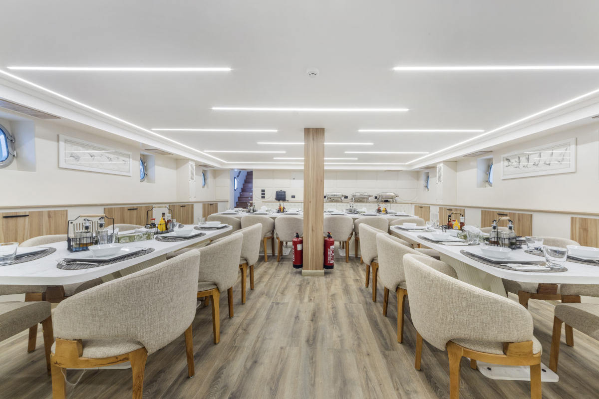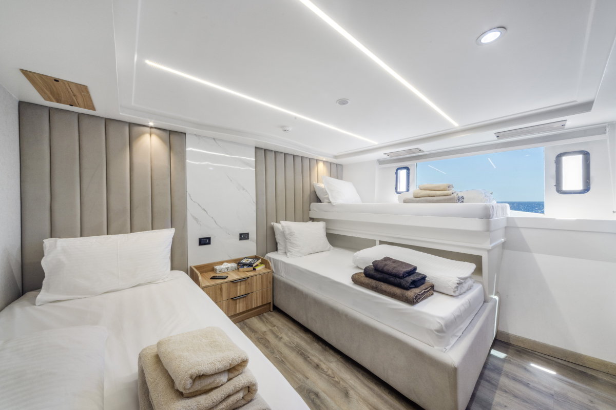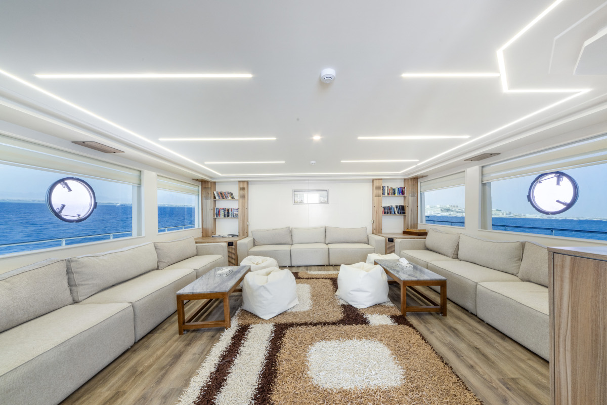 Lunghezza: 35 mt. • Larghezza: 7,5 mt. • 6 cabine doppie e 2 triple (tutte con letti separati) e 2 cabine suite matrimoniali; tutte le cabine sono dotate di servizi privati e aria condizionata regolabile autonomamente • Sala pranzo e bar, TV, video, CD, DVD