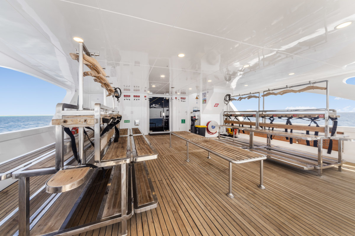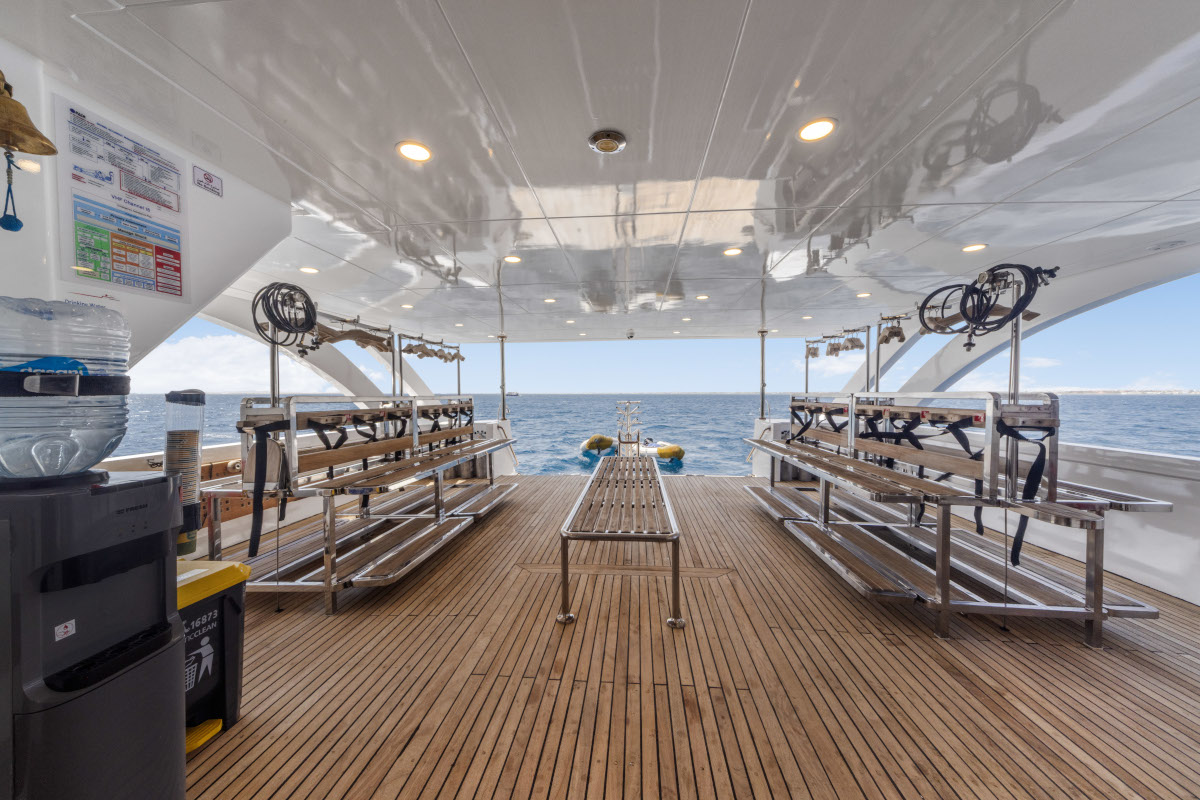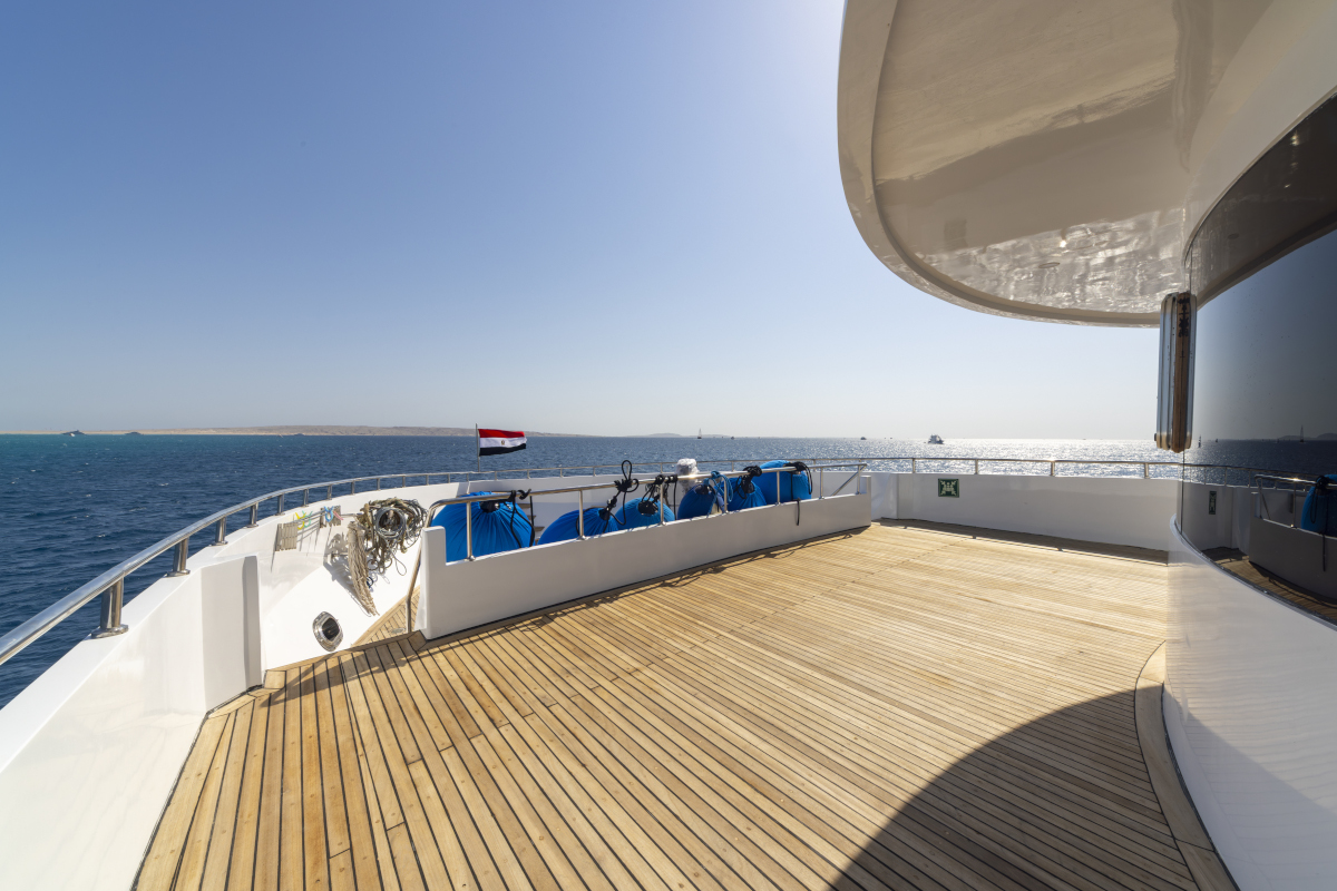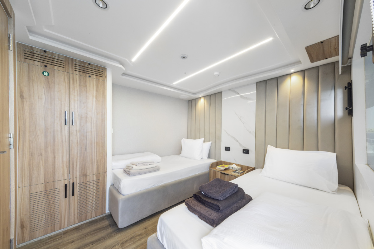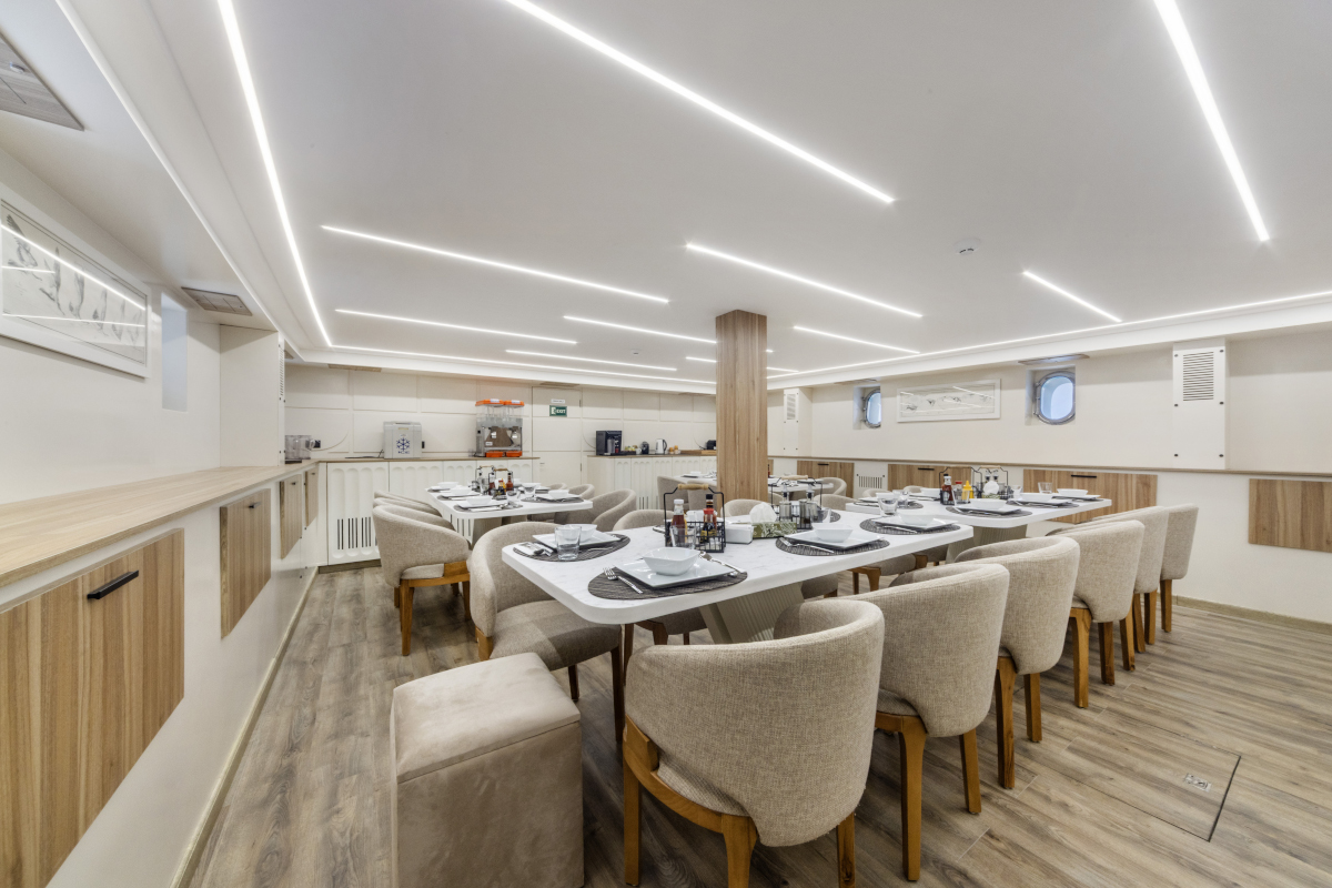 Lunghezza: 35 mt. • Larghezza: 7,5 mt. • 6 cabine doppie e 2 triple (tutte con letti separati) e 2 cabine suite matrimoniali; tutte le cabine sono dotate di servizi privati e aria condizionata regolabile autonomamente • Sala pranzo e bar, TV, video, CD, DVD
