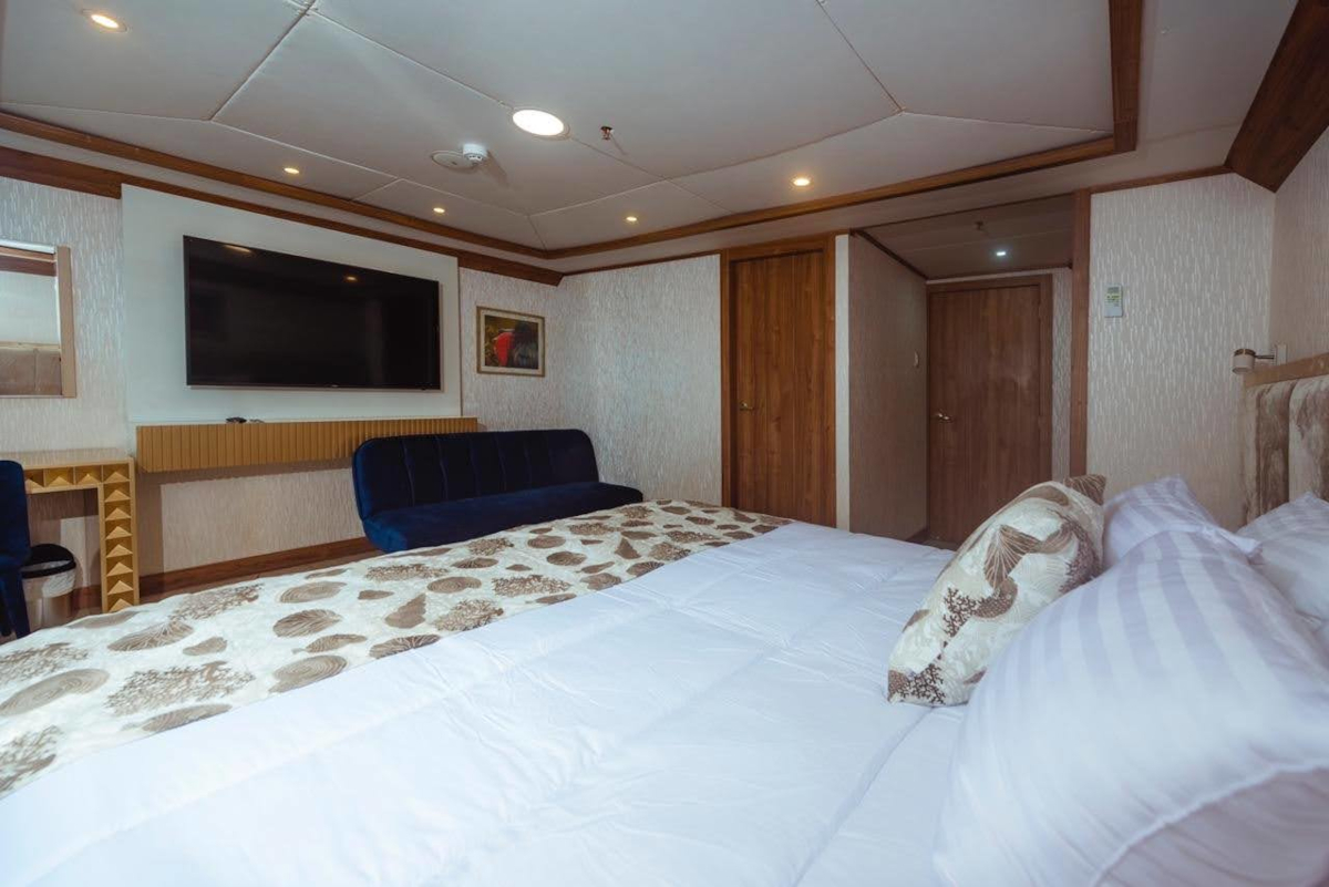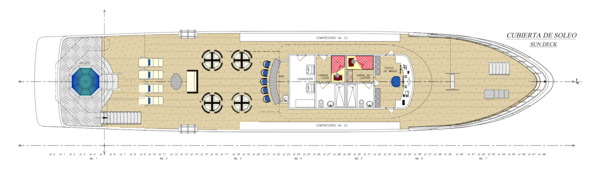 Lunghezza: 38 mt – Larghezza: 7,5 mt – Numero massimo di passeggeri: 16 – N ° cabine 9: 6 cabine sul ponte principale e 3 Suite sul ponte inferiore, tutte con servizi privati ed aria condizionata – Sala lounge e zona pranzo climatizzata – Solarium parzialmente coperto con vasca idromassaggio, lounge e sedie a sdraio – Sistema multimediale con TV/DVD/CD – Wi-Fi a pagamento – Bar – Ampio ponte immersioni – Stazione di ricarica per macchine fotografiche – Noleggio attrezzatura – 2 Tender per le immersioni – Nitrox disponibile, a pagamento
